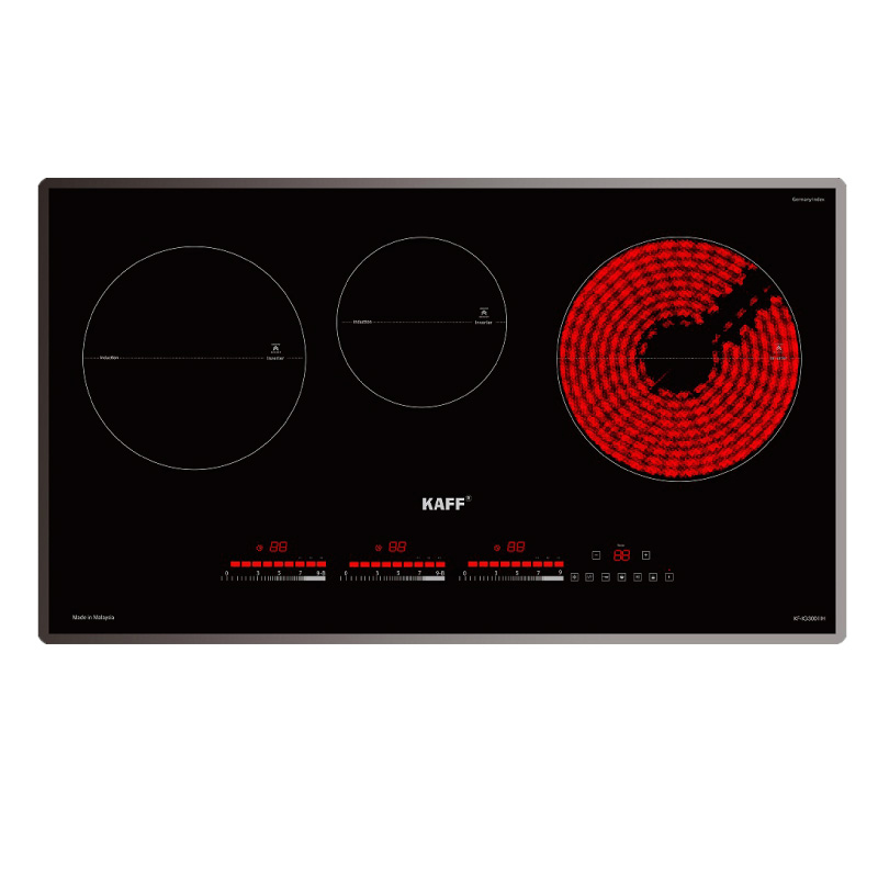 Bếp từ đôi hồng ngoại 3 lò cảm ứng KAFF KF-IG3001IH, thuộc dòng bếp điện từ cao cấp của thương hiệu thiết bị nhà bếp nổi tiếng tại Đức KAFF, là sự kết hợp hoàn hảo giữa 2 bên bếp từ (sử dụng các bộ nồi chảo inox từ, tiết kiệm điện và đun nấu nhanh hơn) và 1 bên bếp điện hồng ngoại (không kén nồi và có thể nướng trực tiếp trên bề mặt bếp), 3 vùng nấu hỗn hợp (2 từ, 1 điện) phù hợp với gia đình đông thành viên và có không gian nhà bếp rộng. giúp cho cuộc sống của bạn thuận tiện hơn.
